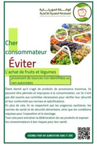 L’Agence Mauritanienne de Sécurité Sanitaire des Aliments (AMSSA) accorde la plus grande importance à la protection de votre santé et de celle de votre famille. C’est pourquoi elle vous invite à être vigilant lors de l’achat de fruits et légumes, en évitant les produits provenant de sources non identifiées ou non autorisées.